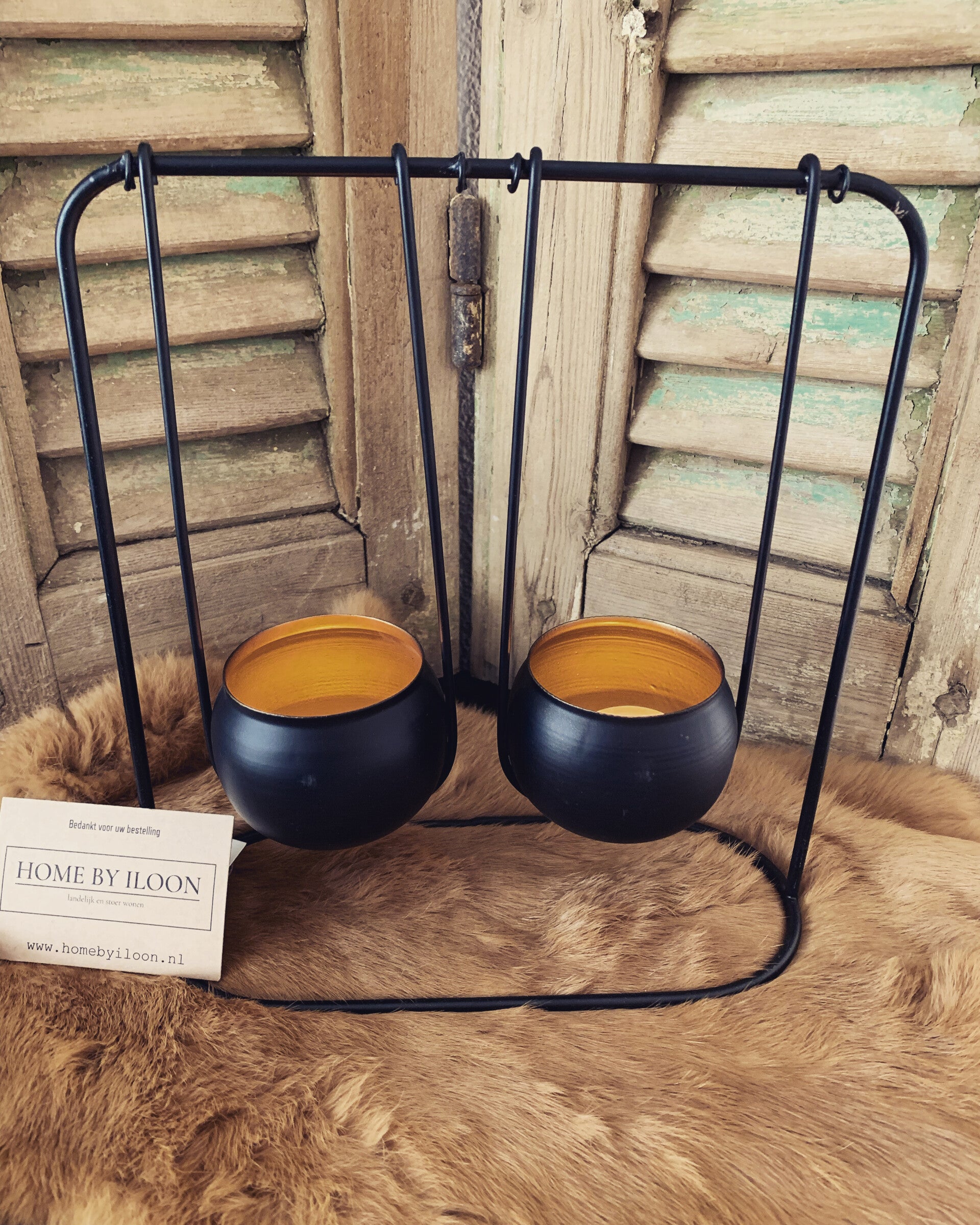 Rekje met twee hangende waxinelichthouders. Het rekje is goudkleurig van binnen. Eventueel ook leuk met amberblokjes erin.