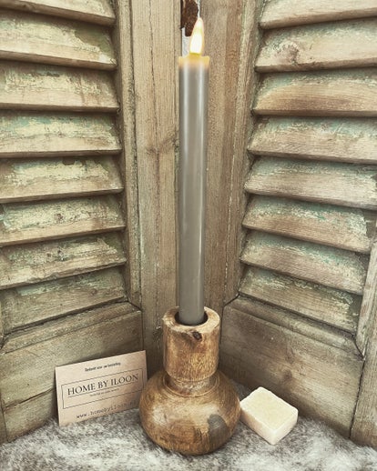 Leuke kleine kandelaar mat zwart. Leuk om ergens bij te zetten. Blijft goed staan door het bolletje op het einde.