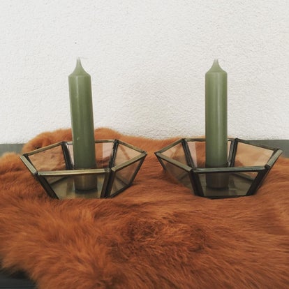 Gave zes hoeks kaarsenhouders van glas. In trendy gouden kleur.